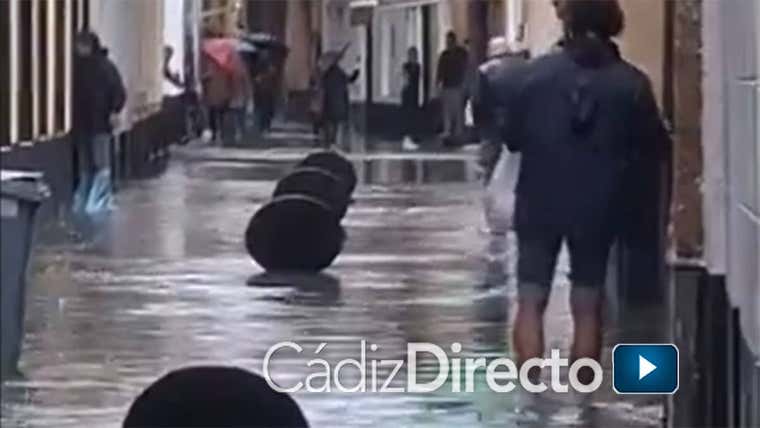 Lugares comerciales como la calle Nueva se transformaron en una riada. Unas precipitaciones que no han parado aún. El aviso de nivel naranja estará activado hasta las 12:00 horas en el Estrecho y el litoral gaditano, donde podrían acumularse hasta 100 litros por metro cuadrado en una hora.