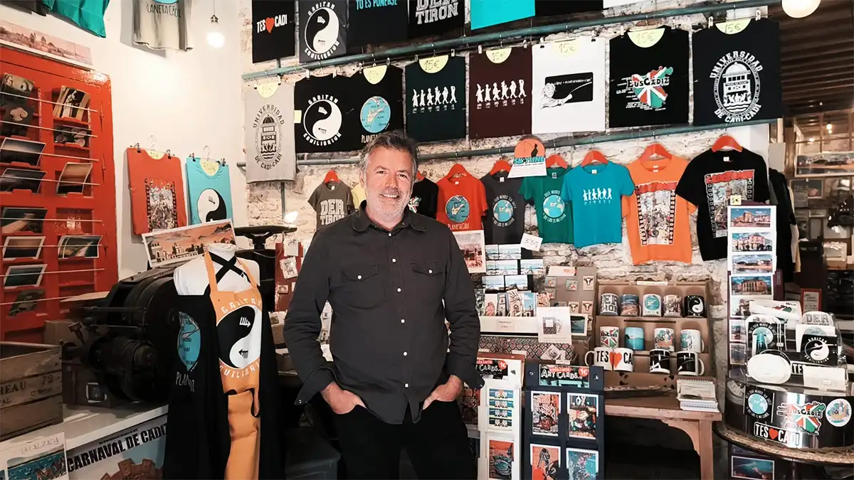 “Todavía no se lo he contado”, bromea Javi, “pero sí, sabemos que tiene varios diseños nuestros”. Entre ellos, algunas de las camisetas más reconocibles de la tienda, como “Planeta Cádiz”.
