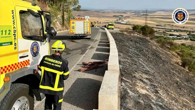 Medina: incendio de pastos y matorral en la carretera CA-203, afectando a 9.000 m2. Debido al fuerte viento se complicó la intervención de los bomberos.