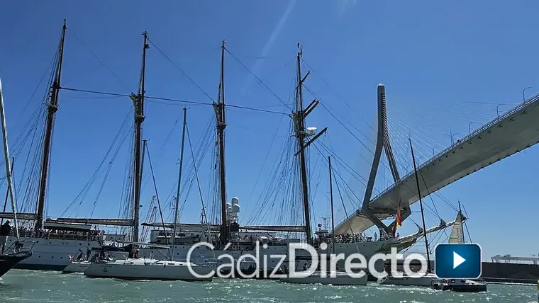 La jornada comenzó temprano en aguas gaditanas. Minutos antes de las nueve de la mañana, el Juan Sebastián de Elcano se dejaba ver en la distancia, enfilando su entrada a la ciudad. El buque escuela de la Armada regresaba tras seis meses de travesía, y no lo hacía solo.
