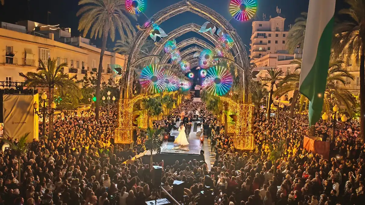 Y entonces llegó el estallido final. La fachada del Ayuntamiento se iluminó por sorpresa, la azotea lanzó efectos de fuego controlado y una lluvia de serpentinas y papelillos —en realidad más bien confeti por el tamaño— cayó sobre la plaza. Fue el instante más celebratorio de la noche: aplausos, gritos y decenas de teléfonos grabando, intentando captar el momento exacto en que Cádiz se llenó de luz.