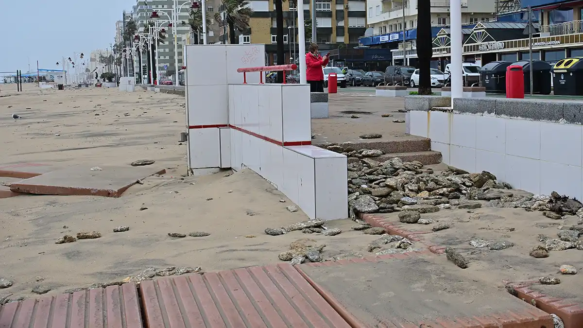 Las playas de Cádiz han sufrido importantes daños como consecuencia del fuerte oleaje y las condiciones meteorológicas adversas. Entre las incidencias detectadas se encuentran pailas y contenedores desplazados, acumulación de arena y piedras en las proximidades del Paseo Marítimo, lavapiés y fuentes enterradas, grandes desniveles en la arena, zonas anegadas por el agua y la presencia de restos de objetos, cañas y tablones de madera arrastrados por el mar.