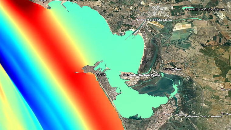 La recreación del maremoto de 1755 a su llegada a Cádiz realizada por el Grupo EDANYA dejaría esta imagen: