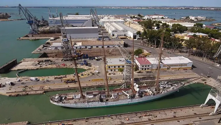 El buque escuela Juan Sebastián de Elcano encara la recta final de su estancia en el astillero de Navantia San Fernando, en el que ha permanecido varado durante los últimos tres meses dentro de su plan periódico de sostenimiento.