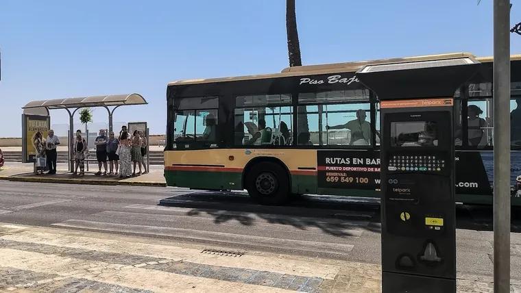 Un autobús urbano de Cádiz entra en una parada del Campo del Sur repleta de personas. Foto: José Luis Porquicho Prada.