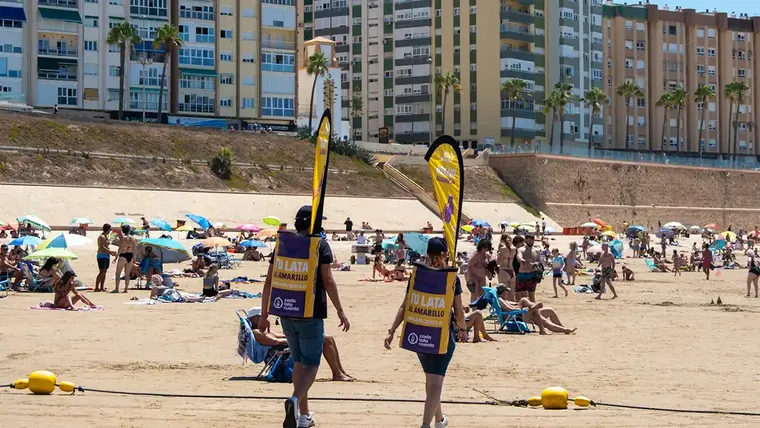 Voluntarios de la campaña 'Tu lata al amarillo' de Cada Lata Cuenta animan a los bañistas a reciclar en la playa de Santa María del Mar.
