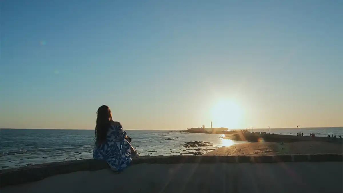 Mujer de espaldas frente al mar en la playa de La Caleta de Cádiz, con el castillo de San Sebastián al fondo y el sol poniéndose en el horizonte.