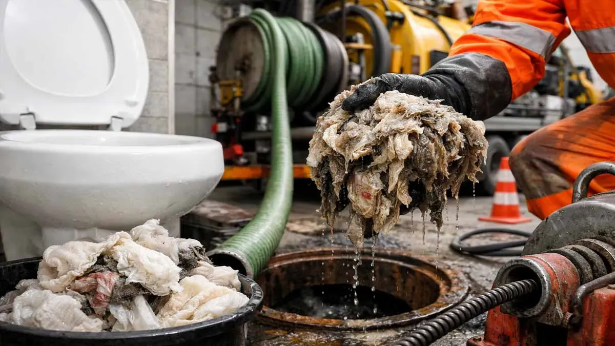 Equipo de desatascos sacando toallitas húmedas de una casa.