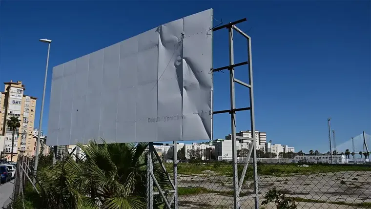 Cartel que anunciaba el proyecto del nuevo hospital, ya con el mensaje borrado por el paso dle tiempo. Foto: Eulogio García.