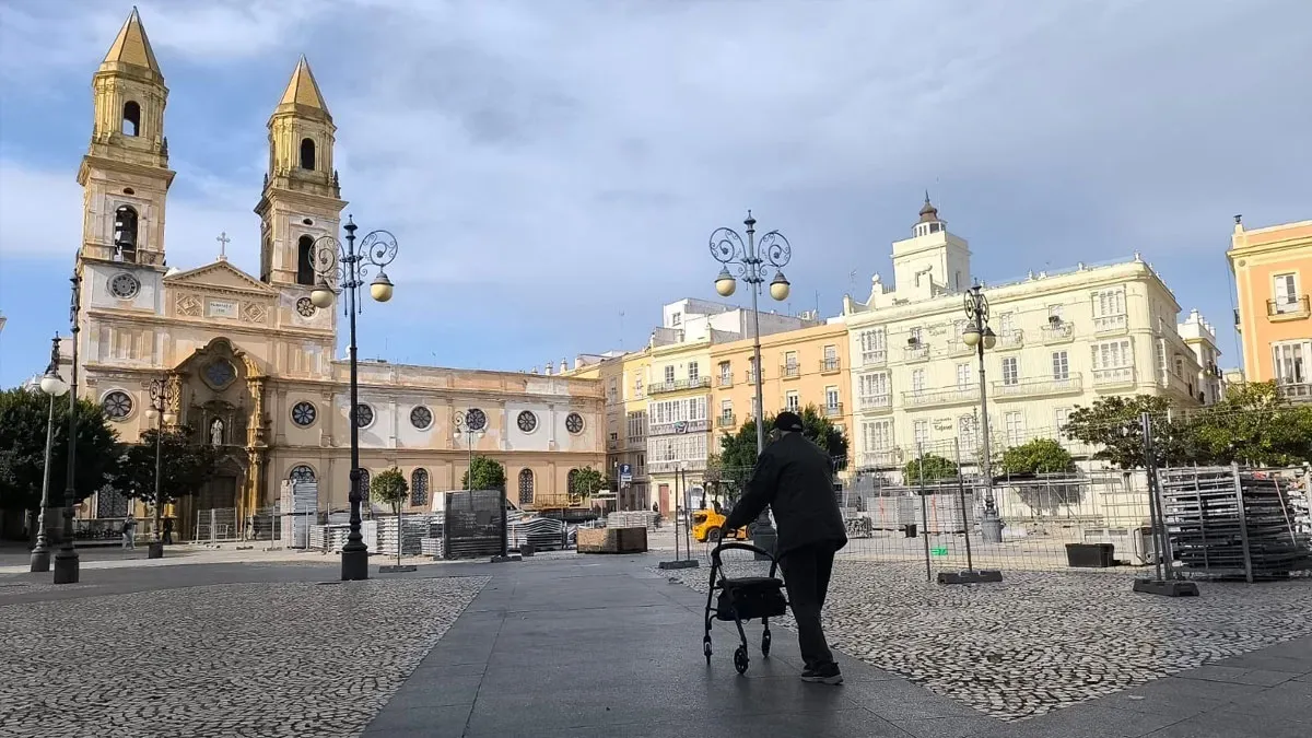Cielos con nubes sobre una plaza de San Antonio de Cádiz con gran actividad este jueves 26 de febrero. Foto: José Luis Porquicho Prada.