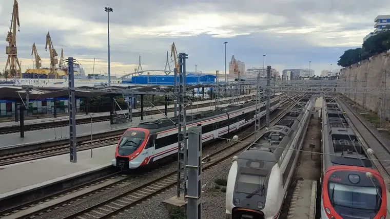 Cielos nubosos sobre la estación de trenes de Cádiz, con los convoyes parados y las grúas de los astilleros al fondo. Foto: Eulogio garcía.