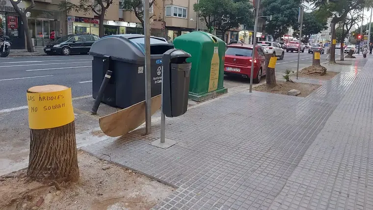 Entre los mensajes escritos a mano se podían leer frases como “Ayuntamiento arboricida”, “Los árboles sanos no se talan, se protegen”, “Los árboles no sobran”, “Vecino, te roban la sombra, el absorber contaminación y un poco de naturaleza” o “Estos árboles talados vilmente tardaron décadas en dar sombra. ¿Qué vais a poner? ¿Toldos, macetones?”.
