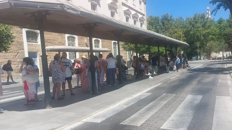 Usuarios esperando al sol en una parada de autobús durante la huelga indefinida que afecta al servicio público en Cádiz y San Fernando.