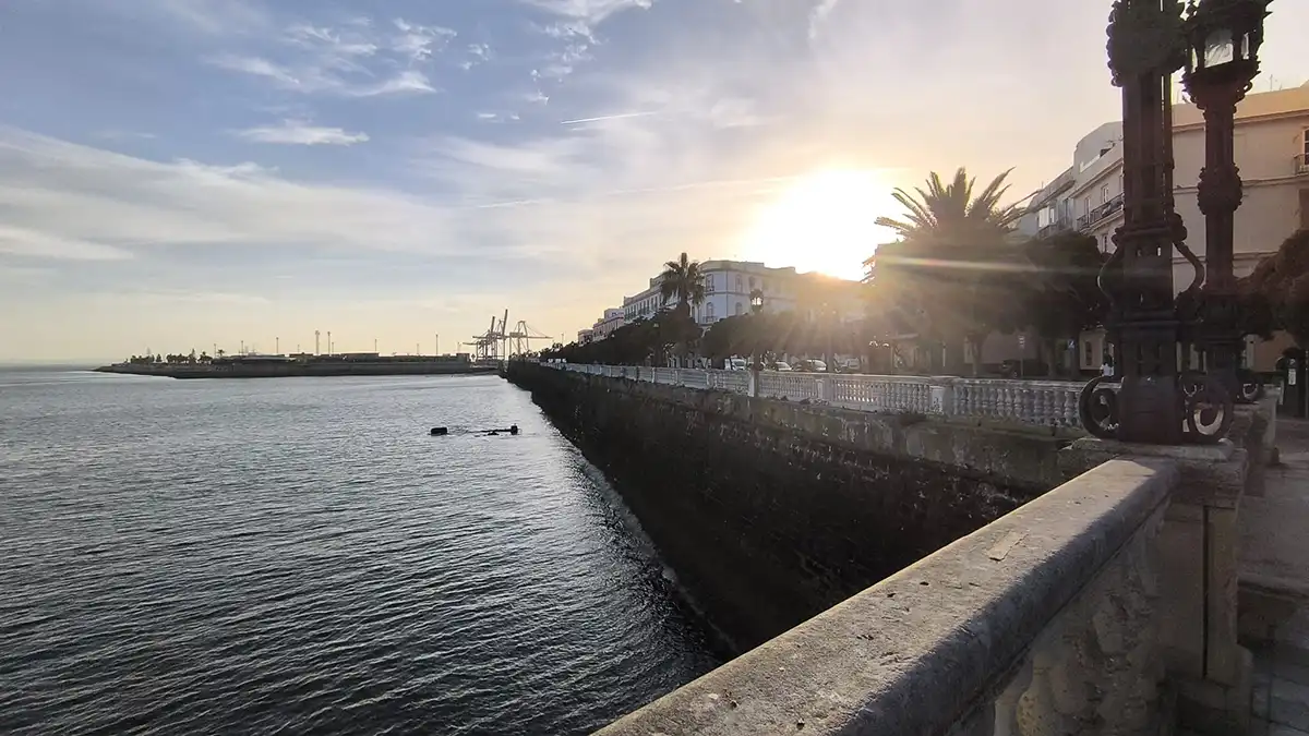 Vista de la bahía de Cádiz en una mañana despejada, con el sol brillando detrás de un edificio y las grúas del muelle recortadas en el horizonte, tomadas desde la Alameda.