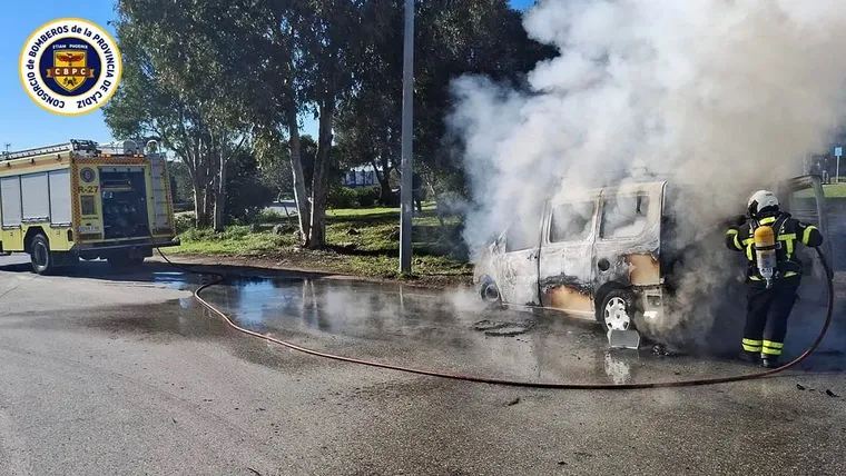 Tarde de tensión en Puerto Real: los bomberos sofocan el fuego que devoró una furgoneta en cuestión de minutos