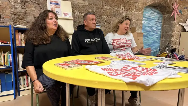 Juan Antonio y Marisol, junto a la portavoz del Sindicato de Inquilinas de Cádiz, María Sánchez, en la rueda de prensa en la que denunciaron el desahucio impulsado por BBVA y el fondo Divarian.