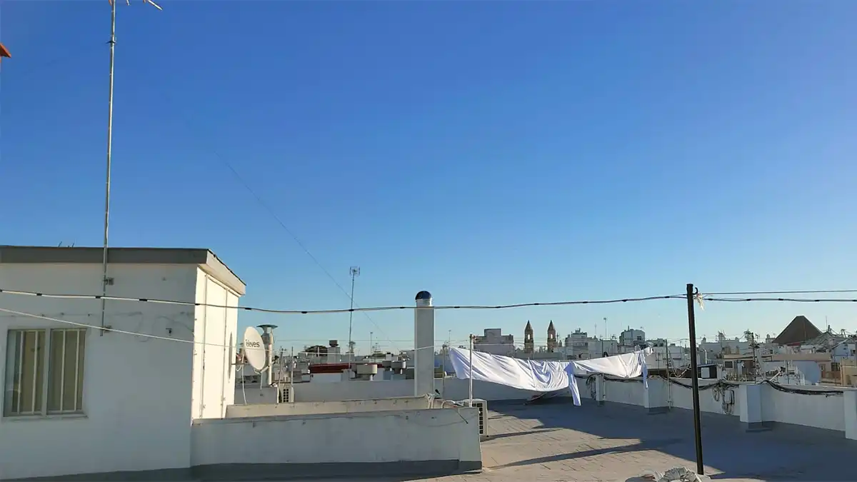 Azotea de Cádiz con ropa tendida y cielo azulísimo, despejado y la Iglesia de San Antonio al fondo