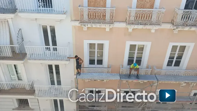 La escalofriante imagen de la inconsciencia: obreros sin protección en un andamio en la Calle Nueva de Cádiz