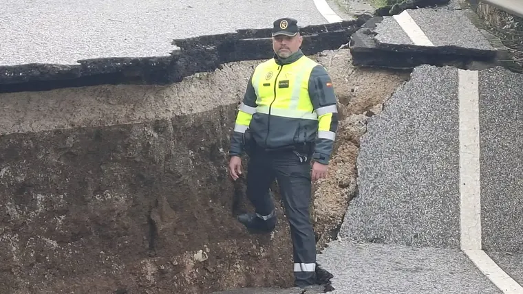 Un guardia civil muestra el tamaño de un hundimienro de una carretera en Cádiz. Foto: Subdelegación del Gobierno.