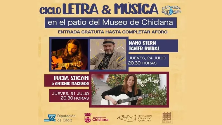 Este jueves 24 de julio, el patio del Museo de Chiclana se transformará en un espacio de encuentro entre la palabra y el sonido, con la participación estelar de Nano Stern y Javier Ruibal en lo que será una nueva entrega del ciclo cultural Letra & Música, una iniciativa de la Fundación Fernando Quiñones en colaboración con el Ayuntamiento de Chiclana.