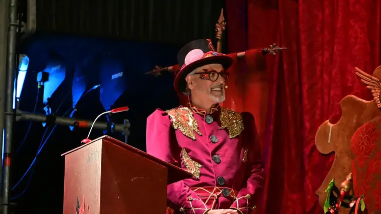 Gueli Villegas, emocionado durante su pregón como Dios Momo, rinde homenaje a su familia y a la tradición del Carnaval gaditano en una Plaza de San Antonio entregada.