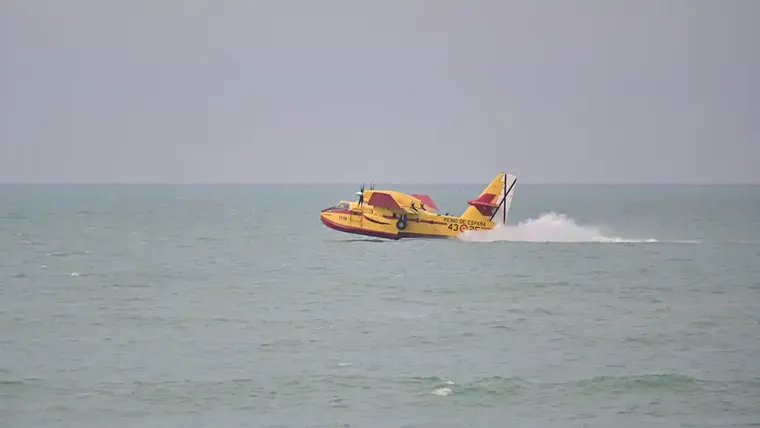 No se trataba de una emergencia, sino de un Canadair CL-415, el característico avión amarillo y rojo del Ejército del Aire y del Espacio, que realizaba maniobras de entrenamiento y toma de agua frente a la Playa de la Victoria.