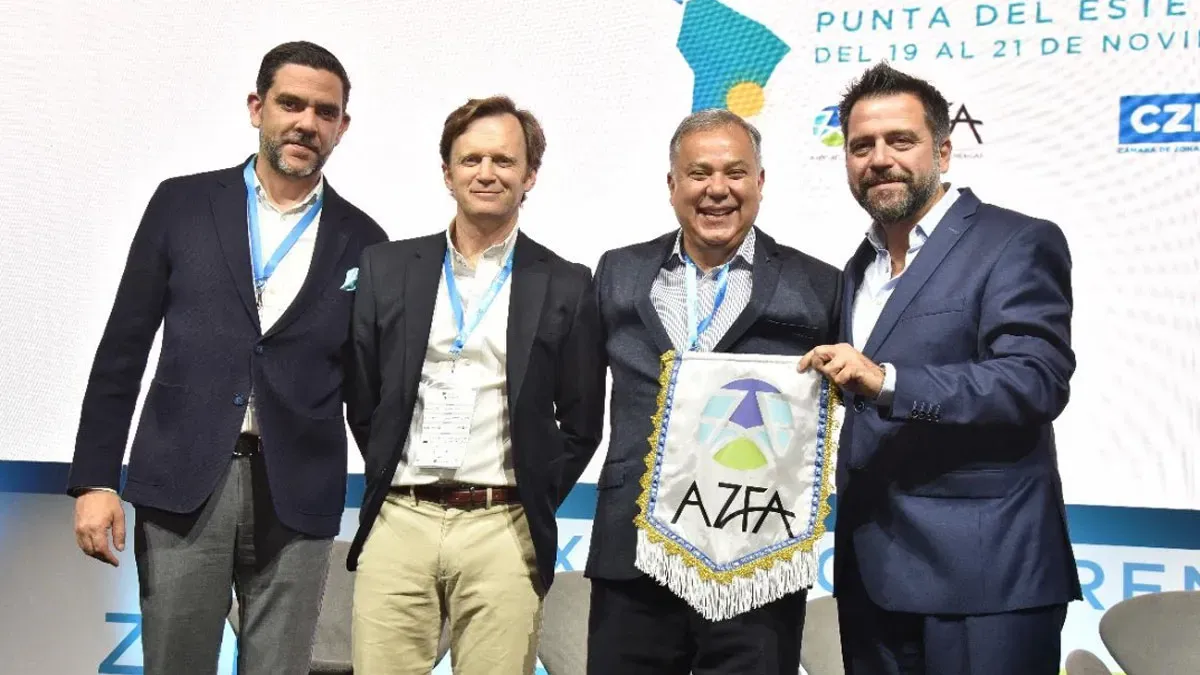 Durante la ceremonia de traspaso de sede, Fran González recibió el testigo de manos de Carlos Wong, vicepresidente de la Asociación de Zonas Francas de las Américas (AZFA); Enrique Buero, presidente de la Cámara de Zonas Francas; y Julio Rodríguez, director ejecutivo de la organización.