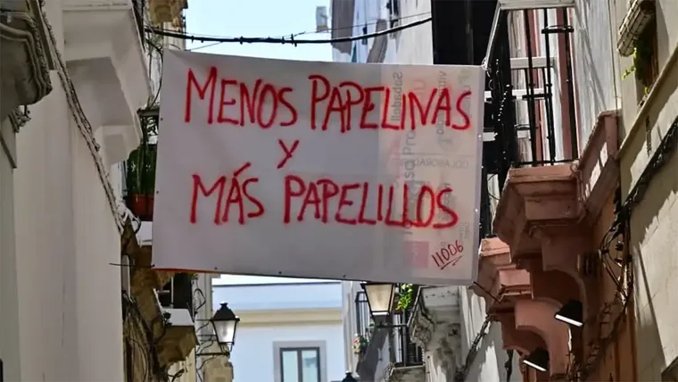 Entre las pancartas más llamativas están las que recurren a expresiones muy reconocibles en Cádiz para convertir la protesta en un mensaje cercano y con sello propio. “Menos papelinas y más papelillos” resume esa mezcla entre denuncia y lenguaje gaditano. “Menos menudeo, más menudo” juega con la misma idea y sitúa el foco en la venta de droga al por menor, señalada por los vecinos como uno de los principales problemas que se han ido consolidando en el barrio.
