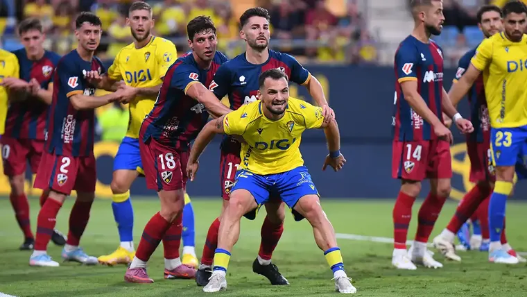 El jugador del Cádiz CF Tabatadze puja por la posición con un defensa de la SD Huesca. Foto: Cádiz CF.