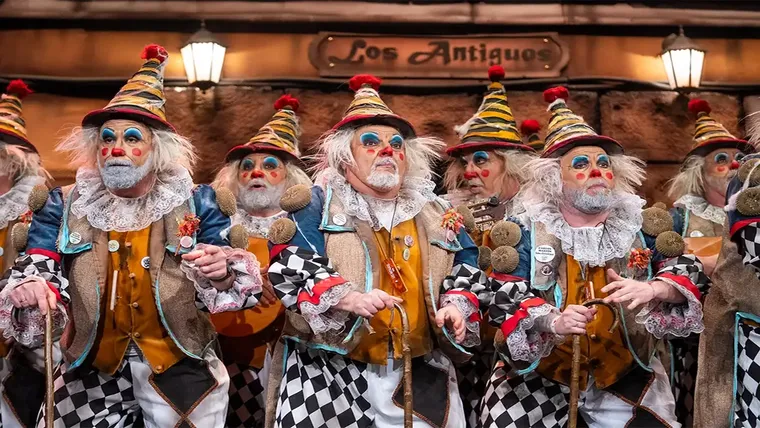 Chirigota Los antiguos en el pase de cuartos de final. COAC 2026. Foto: José María Reyna