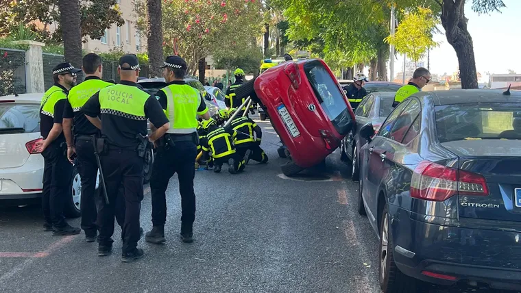 El Consorcio de Bomberos de la Provincia de Cádiz confirmó que el vehículo quedó parcialmente volcado sobre su lateral derecho, apoyado contra otro turismo estacionado. Dentro se encontraba la conductora, que fue rescatada tras estabilizar el coche y colaboró sin dificultad para salir, sin aparentes lesiones.