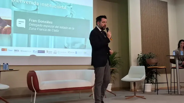 Fran González, delegado del Estado en la Zona Franca de Cádiz, durante la clausura del proyecto IberoBio en el edificio Heracles.