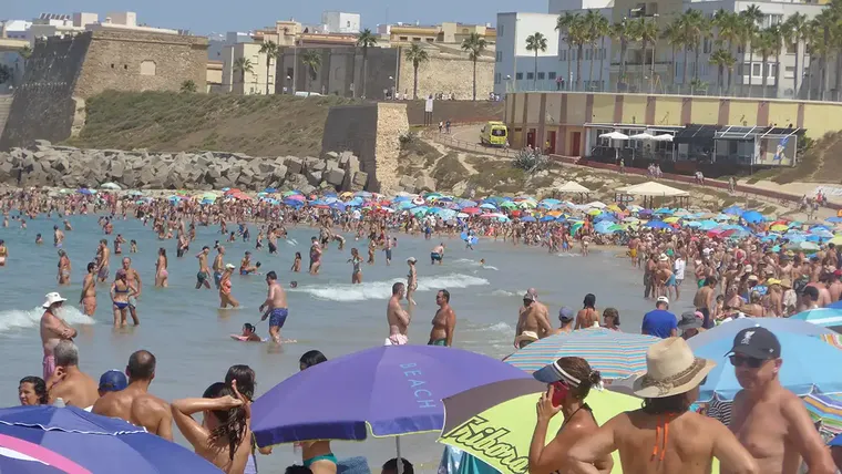 Las playas serán un refugio estos días de calor. En la imagen, domingo con marea alta en la playa de Santa María del Mar de Cádiz. Foto: Eulogio García.