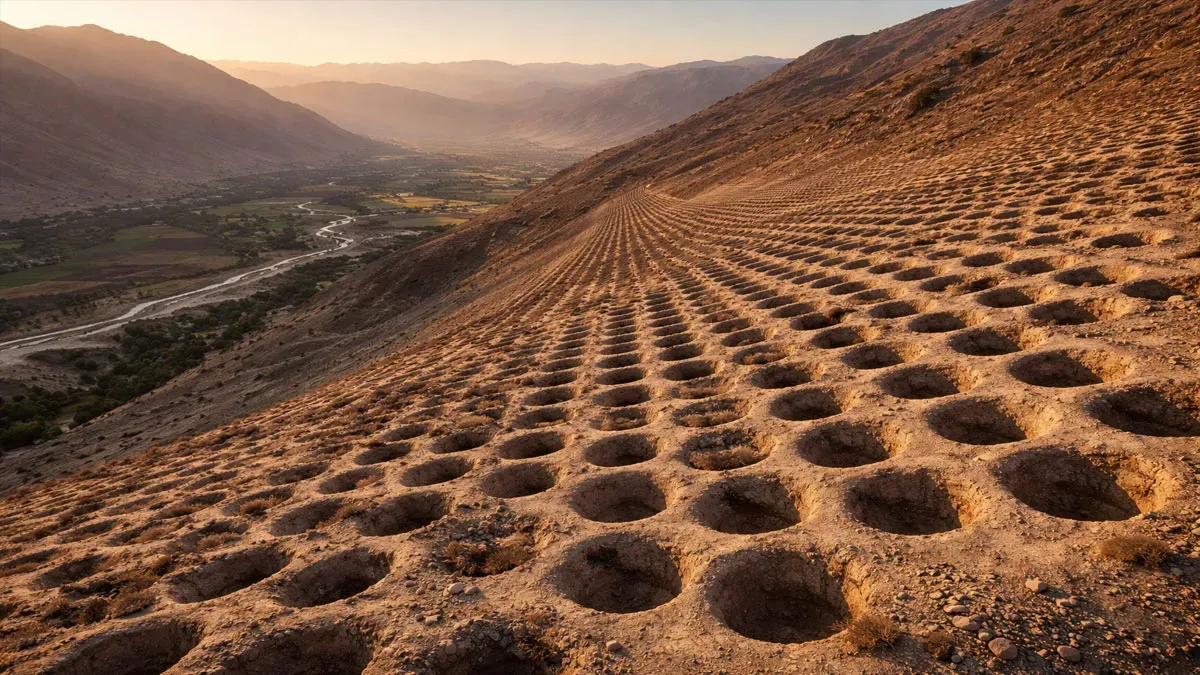 Los investigadores, liderados por el arqueólogo digital Jacob Bongers, utilizaron tecnología de drones así como de análisis de suelos para estudiar este conjunto de más de 5.200 pozos distribuidos en una ladera árida, cuyas dimensiones varían entre uno y dos metros de ancho y medio metro a un metro de profundidad.
