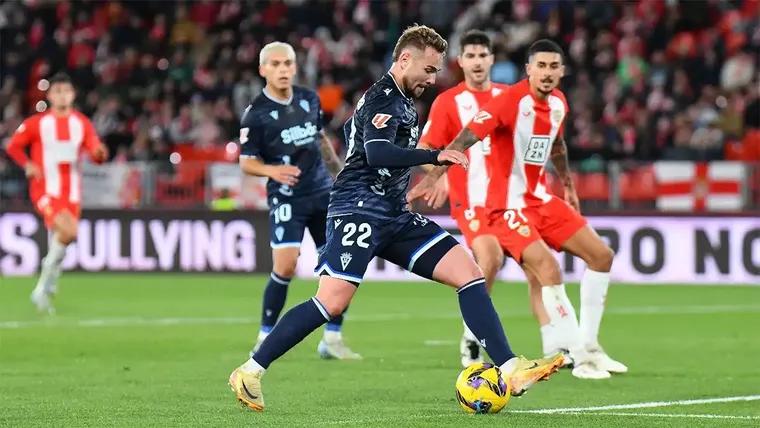 Ontiveros remata en el que sería el 0-1 para el Cádiz CF ante el Almería. En la segunda mitad, fue expulsado. Foto: Cádiz CF.