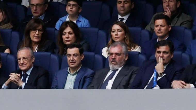 Vizcaíno y Contreras (a la derecha) en el palco del Bernabéu junto a Juanma Moreno y Florentino Pérez. Foto: X Juanma Moreno.