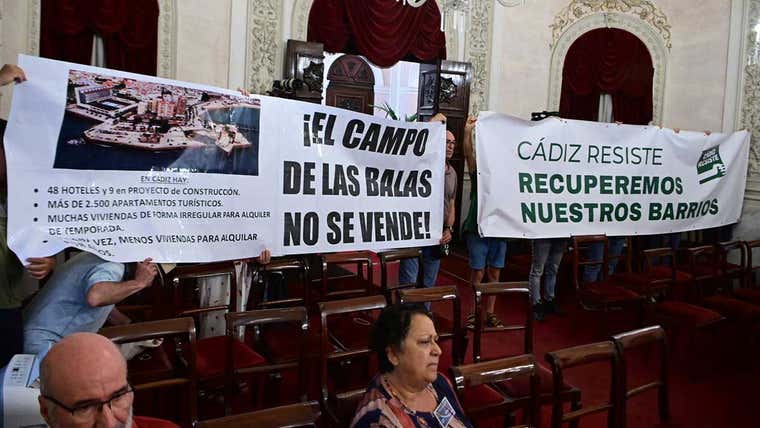 Pero no ha sido la única protesta de la doble sesión. Integrantes de la Plataforma Ciudadana El Campo de las Balas no se vende y del colectivo Cádiz Resiste desplegaron sendas pancartas en la segunda sesión, la de aprobación definitiva de los presupuestos para 2024. Además, al término de la sesión pidieron que no se vendiera el terreno y que se frenara la proliferación de pisos turísaticos. "Más viviendas sociales y menos hoteles", gritaron, además de pedir que no se vendiera el Campo de las Balas.