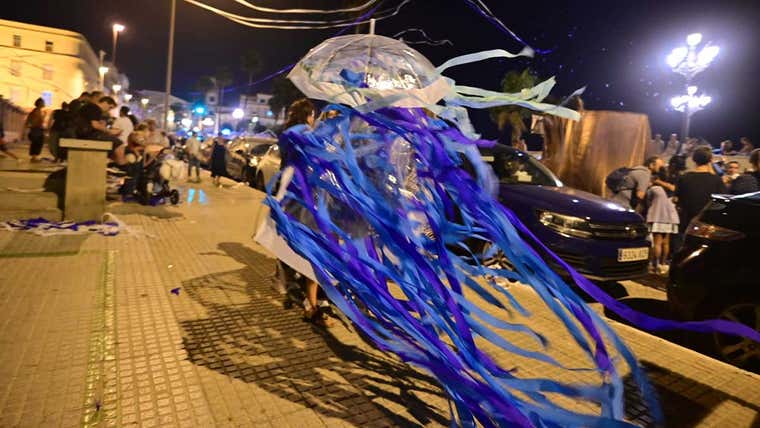 El Levante ya hacía ahí de las suyas y lo que podría haber sido una espectacular imagen de esa marea de paraguas azules por el Paseo Fernando Quiñones se convirtió en casi una travesía por esa zona. Hasta ganar la puerta de La Caleta, donde se debía formar el pasacalles como tal.