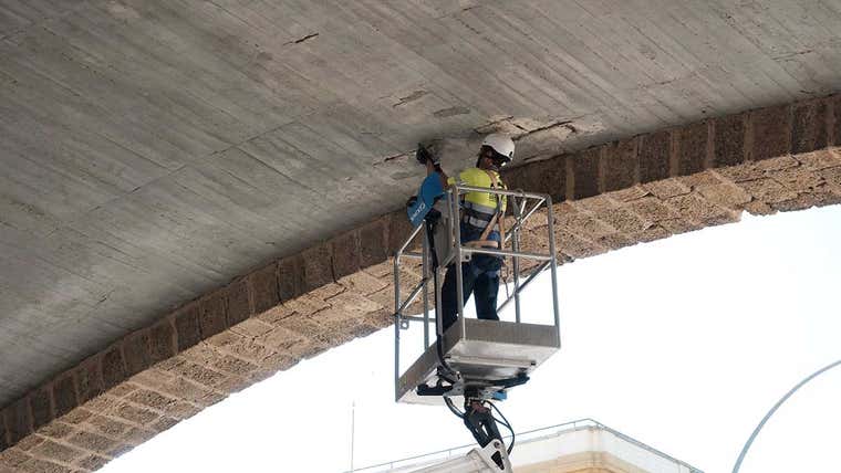 Durante esta intervención, un operario municipal, utilizando una plataforma elevadora, retiró fragmentos de hormigón de las zonas afectadas para prevenir posibles desprendimientos peligrosos sobre la calzada. Los técnicos de Urbanismo, presentes en el lugar, supervisaron la operación, revisando y fotografiando los arcos para evaluar el alcance de los daños.