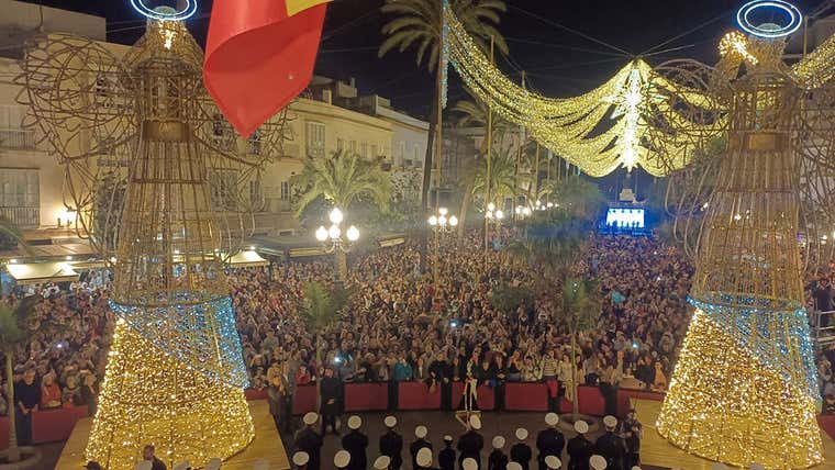 La Plaza de San Juan de Dios estaba repleta de público para disfrutar del espectáculo que había anunciado el Ayuntamiento en esta puesta de largo del alumbrado. En realidad, todo el centro estaba repleto de gente. Y eso que el horario coincidía con el encuentro de fútbol del Cádiz CF ante el Deportivo.