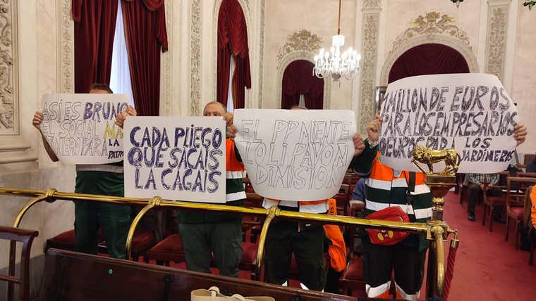 Representantes de la plantilla de Parques y Jardines durante su prostesta en el Pleno del Ayuntamiento de Cádiz. Foto: Eulogio García.