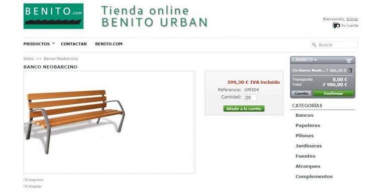 El banco que se ha colocado en la Avenida es el modelo Neobarcino de la empresa Benito, tal y como se aprecia en una de las fotografías que el propio gabinete de prensa municipal remitió a los medios. En la propia página web de esta compañía aparece que el coste de cada unidad es de 399,30 euros, IVA incluido y que no cobran gastos de transportes, por lo que el montante total de la compra de 20 bancos asciende a 7.986 euros. Pero es que en otras páginas, este mismo banco se puede adquirir, por ejemplo, a 346,92 euros, más impuestos (ver producto) con lo que las 20 unidades saldrían en 6.938,4 euros.
