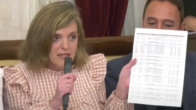 La concejala Mayte González muestra la hoja de Excel con los gastos del Cádiz Fenicia durante el último Pleno. Foto: Onda Cádiz.