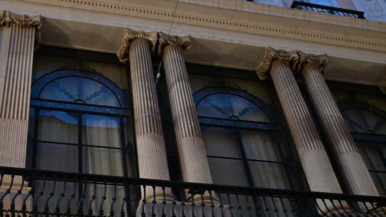 El Palacio de Moreno de Mora aparece con una cable atado a una de sus columnas en medio de la campaña ‘Orgullos@s de Nuestra Historia’, lo que ha provocado críticas por la falta de cuidado al patrimonio
