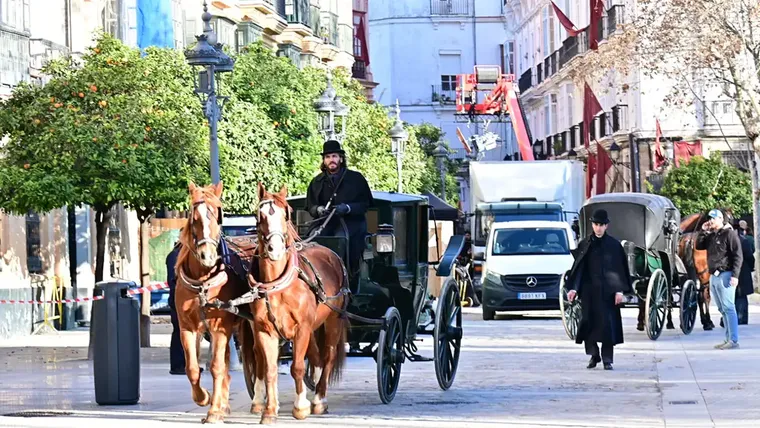 Llegó el día y se ha notado. La Plaza de España estaba igual que una feria, que hubiera dicho la copla. El rodaje de la serie Young Sherlock ha comenzado en la plaza de Argüelles de Cádiz y entre vehículos, extras y equipo era difícil no darse cuenta.
